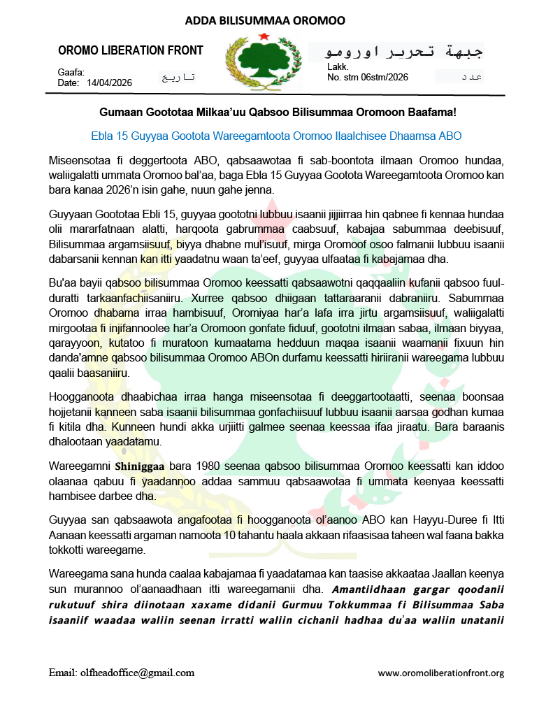 Kabajaa Guyyaa Gootota Wareegamtoota Oromoo baranaa (2026) kan adda godhu wayta ABOn qabsoo karaa nagaa geggeessaa jiru keessatti yeroo duraatiif filannoo marsaa 7ffaa Itoophiyaa keessatti geggeeffamuuf jiru irraa qooda fudhatuuf murteessee sossohaa jiru keessatti. Murtii kanaanis saba keenyaaf nagaa argamsiisuuf, daandii kanaanis kaayyoo qabsoo bilisummaa Oromoo kan wareegamtootni ilmaan Oromoo kumaa kitilli irratti kitimaman osoo hin sharafin milkeessuuf carraaqqii olaanaa haala godhaa jiru keessatti.