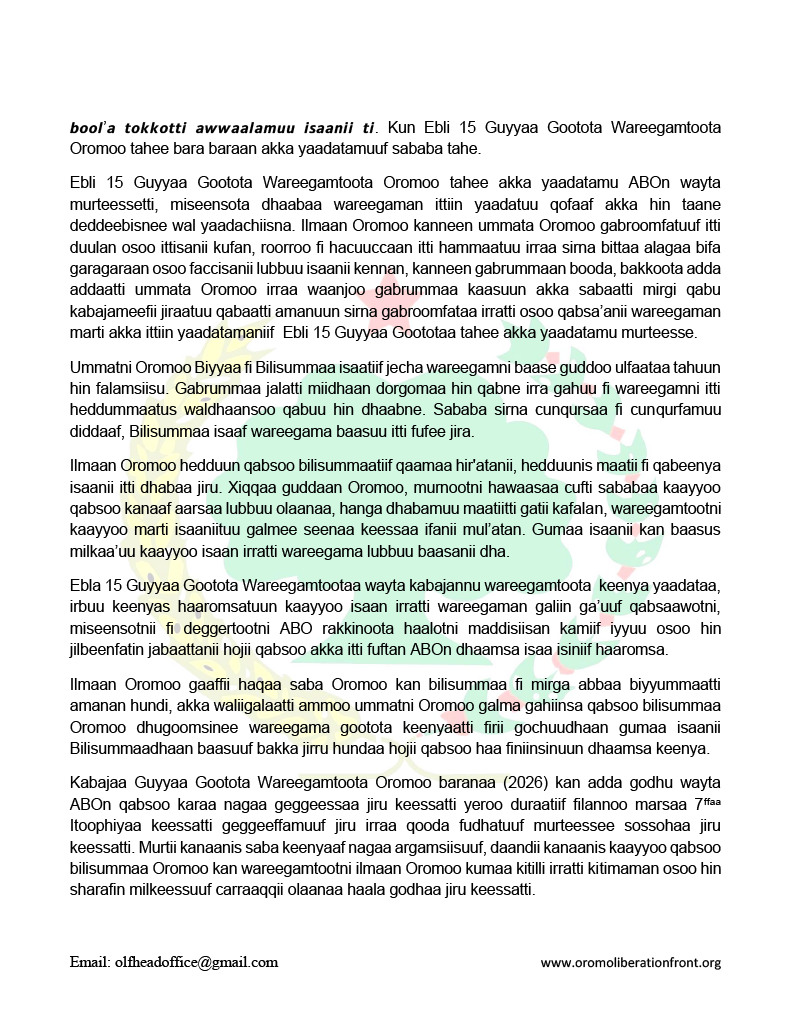 Miseensotaa fi deggertoota ABO, qabsaawotaa fi sab-boontota ilmaan Oromoo hundaa, waliigalatti ummata Oromoo bal’aa, baga Ebla 15 Guyyaa Gootota Wareegamtoota Oromoo kan bara kanaa 2026’n isin gahe, nuun gahe jenna.