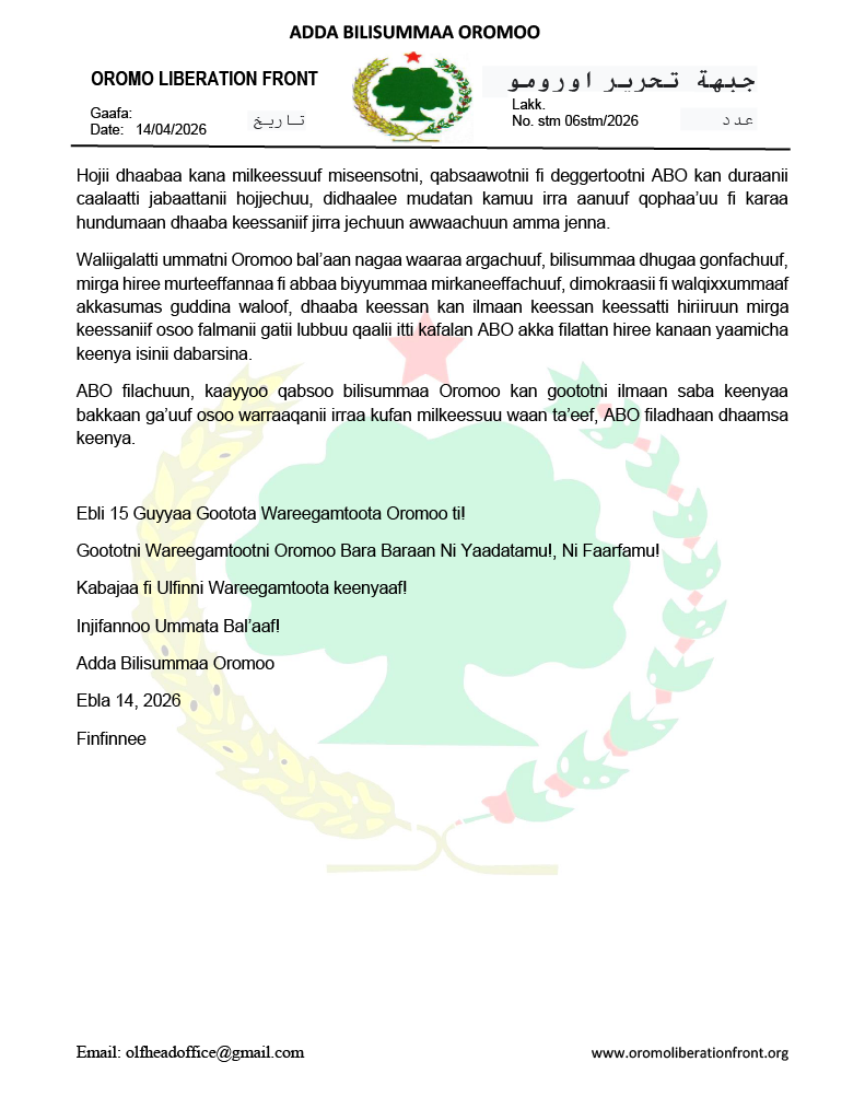 Waliigalatti ummatni Oromoo bal’aan nagaa waaraa argachuuf, bilisummaa dhugaa gonfachuuf, mirga hiree murteeffannaa fi abbaa biyyummaa mirkaneeffachuuf, dimokraasii fi walqixxummaaf akkasumas guddina waloof, dhaaba keessan kan ilmaan keessan keessatti hiriiruun mirga keessaniif osoo falmanii gatii lubbuu qaalii itti kafalan ABO akka filattan hiree kanaan yaamicha keenya isinii dabarsina.